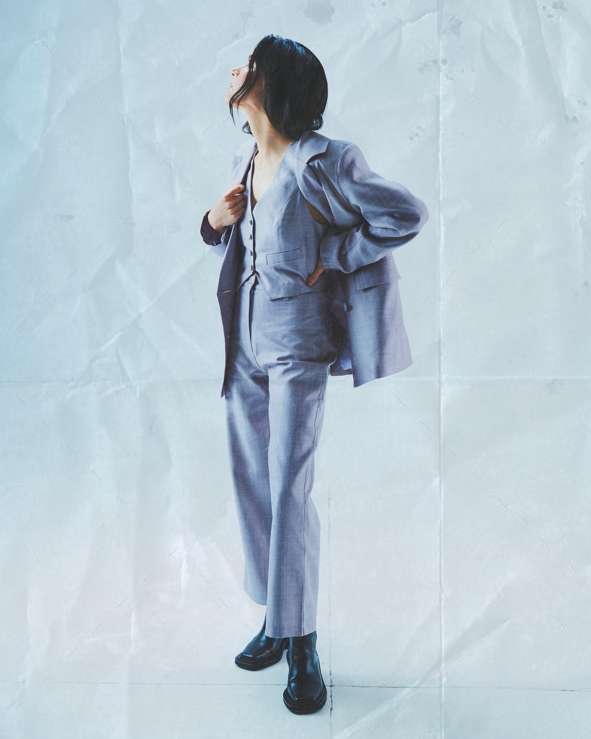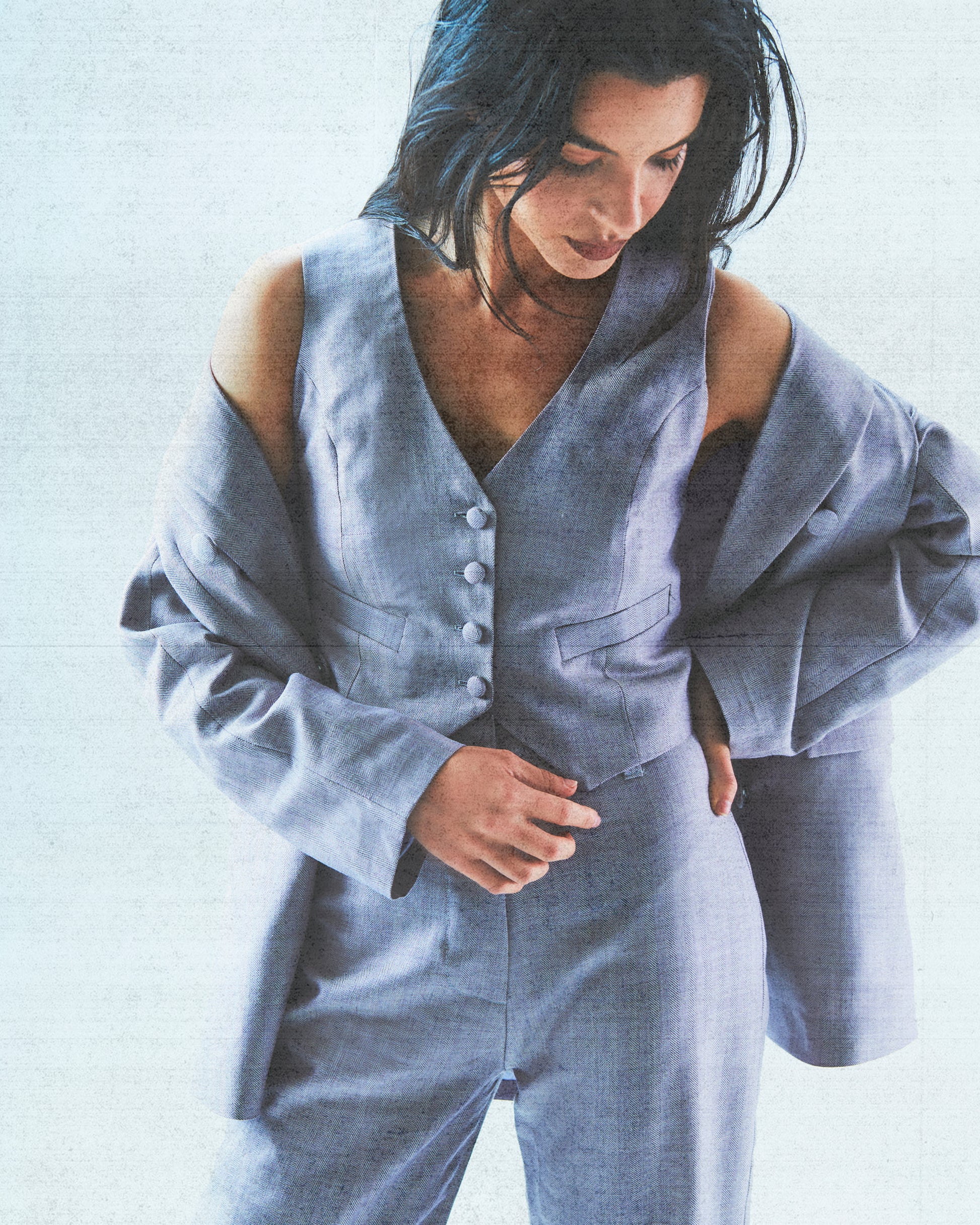 Tailored in lightweight wool and silk. 3-piece suit, including the new oversized Maxi Jacket, 6 exterior buttons and interior pocket, David Gilet and the classic straight-cut trousers with a waistband.