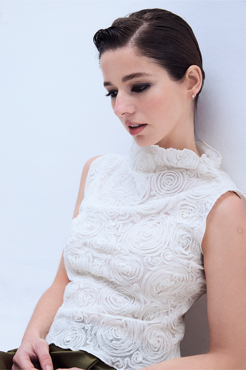 Top confeccionado a partir de encaje de algodón elasticado, con cuello alto.