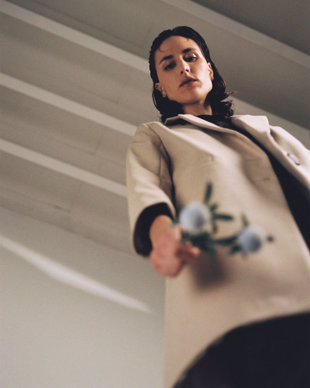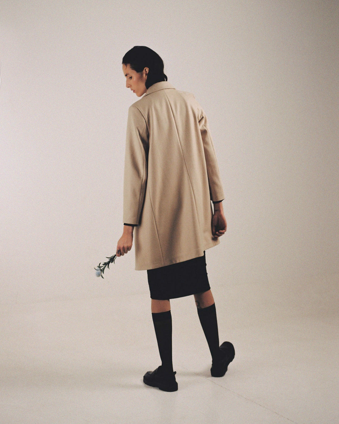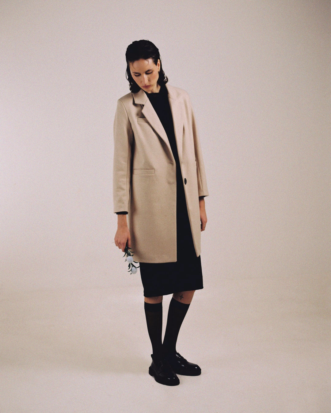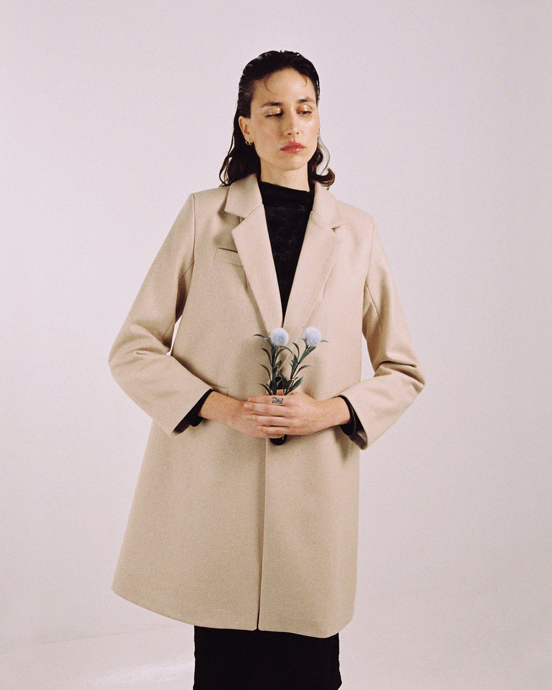 Abrigo de calce oversize confeccionado en paño de lana 100% lana color crema. Modelo perfecto para usar con chalecos o chaquetas bajo el abrigo.