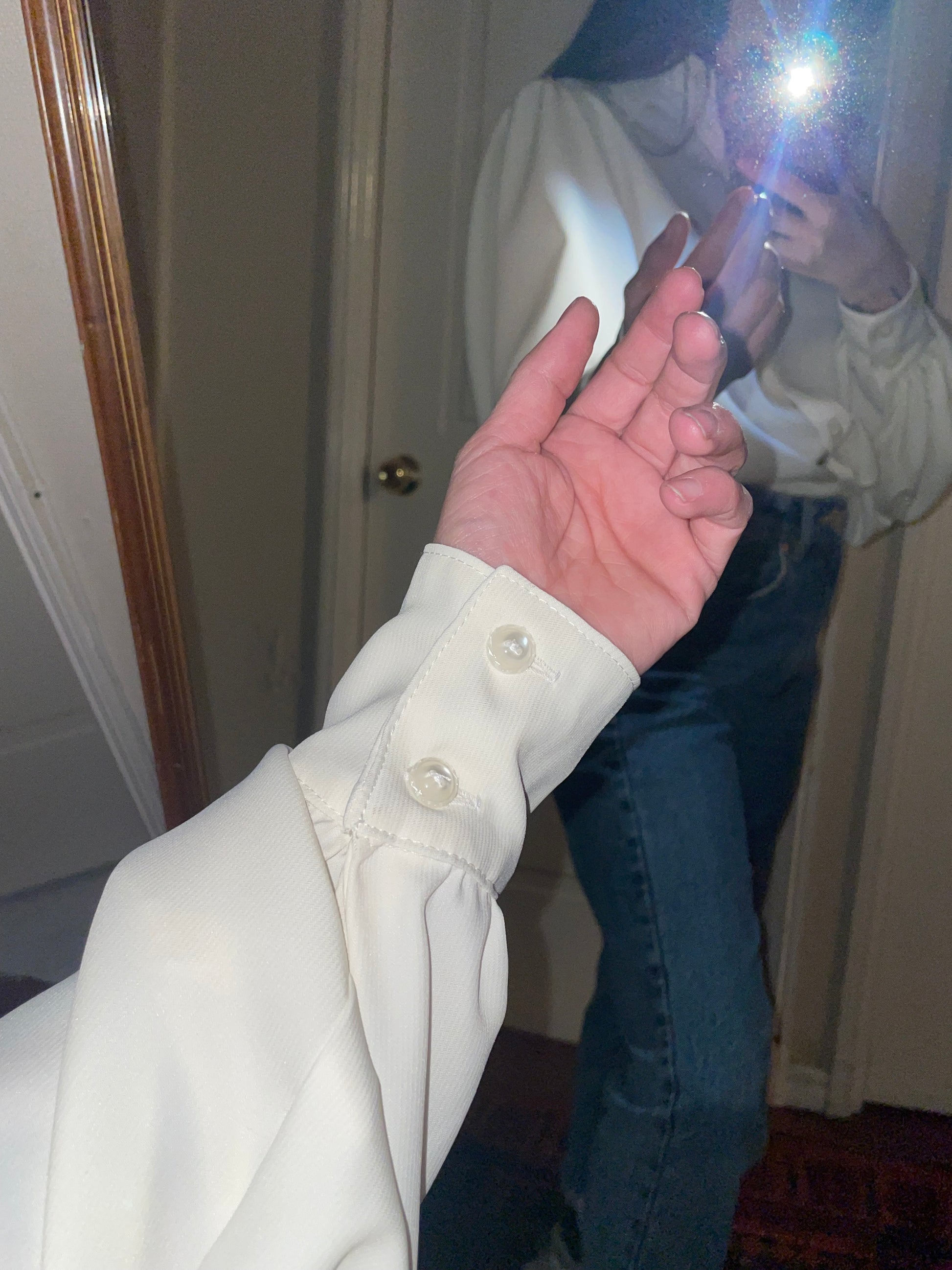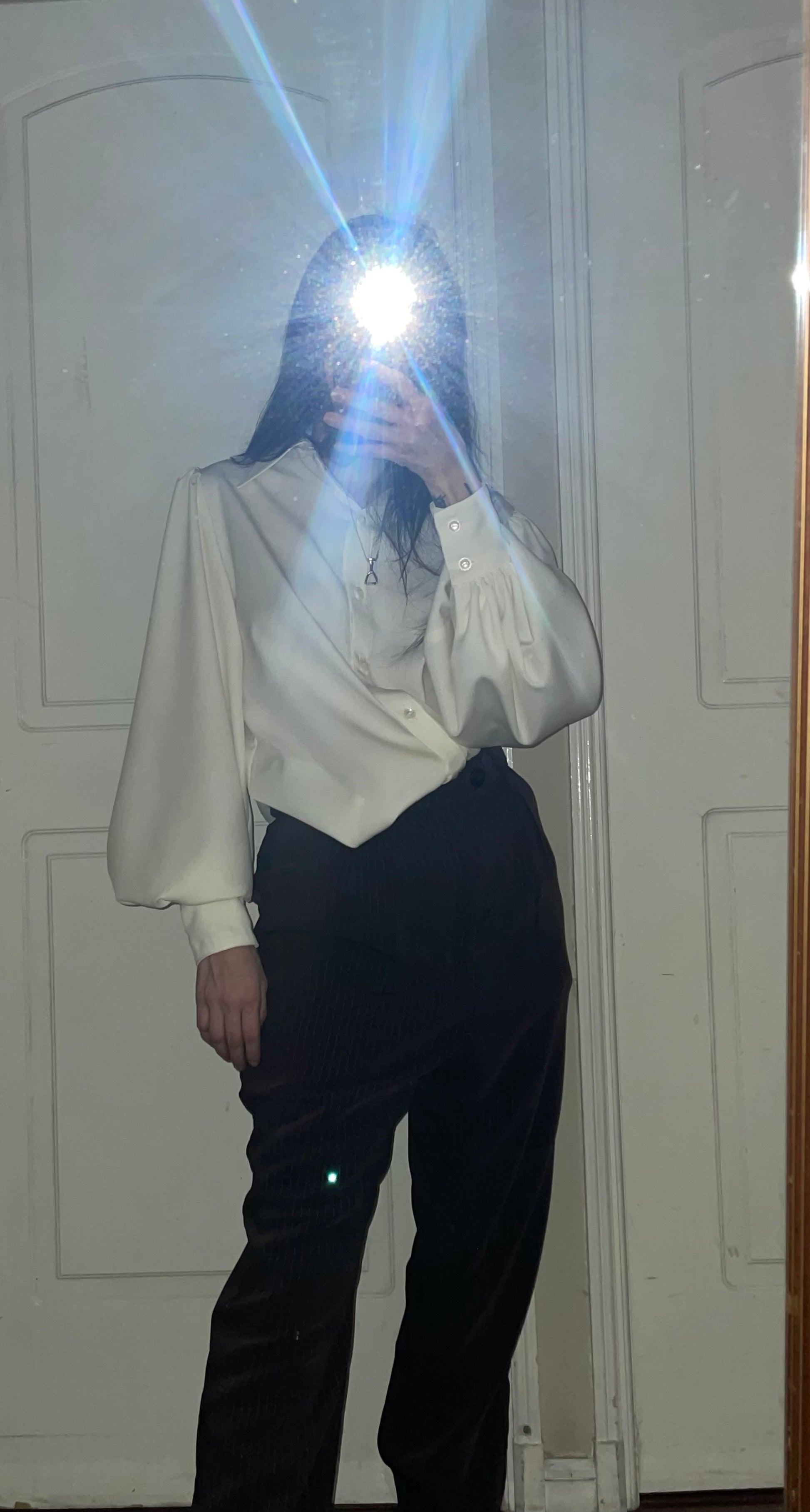 Modelos de Blusa con mangas amplias y puño alto. Confeccionada en gasa crema.