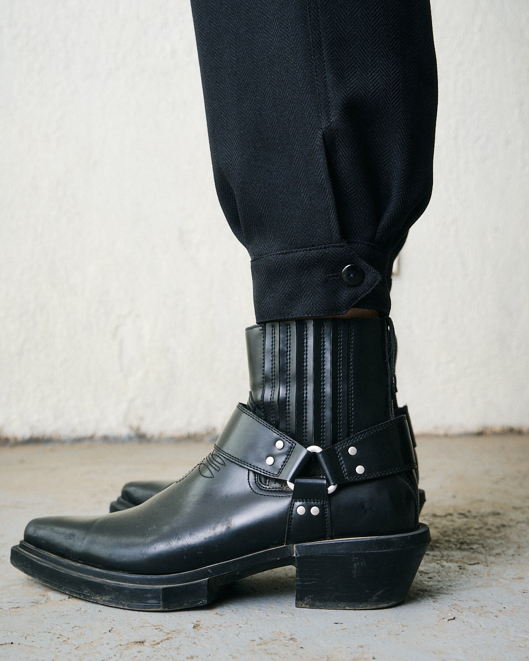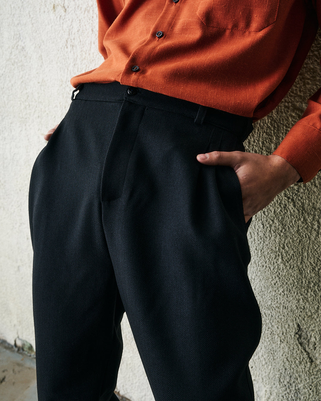 Pantalón inspirado en el diseño de pantalones del gaucho uruguayo, estilo bombacha, con puños en basta. Confeccionados en lanilla color negro. Tela con diseño de trama ascendente y descendente.