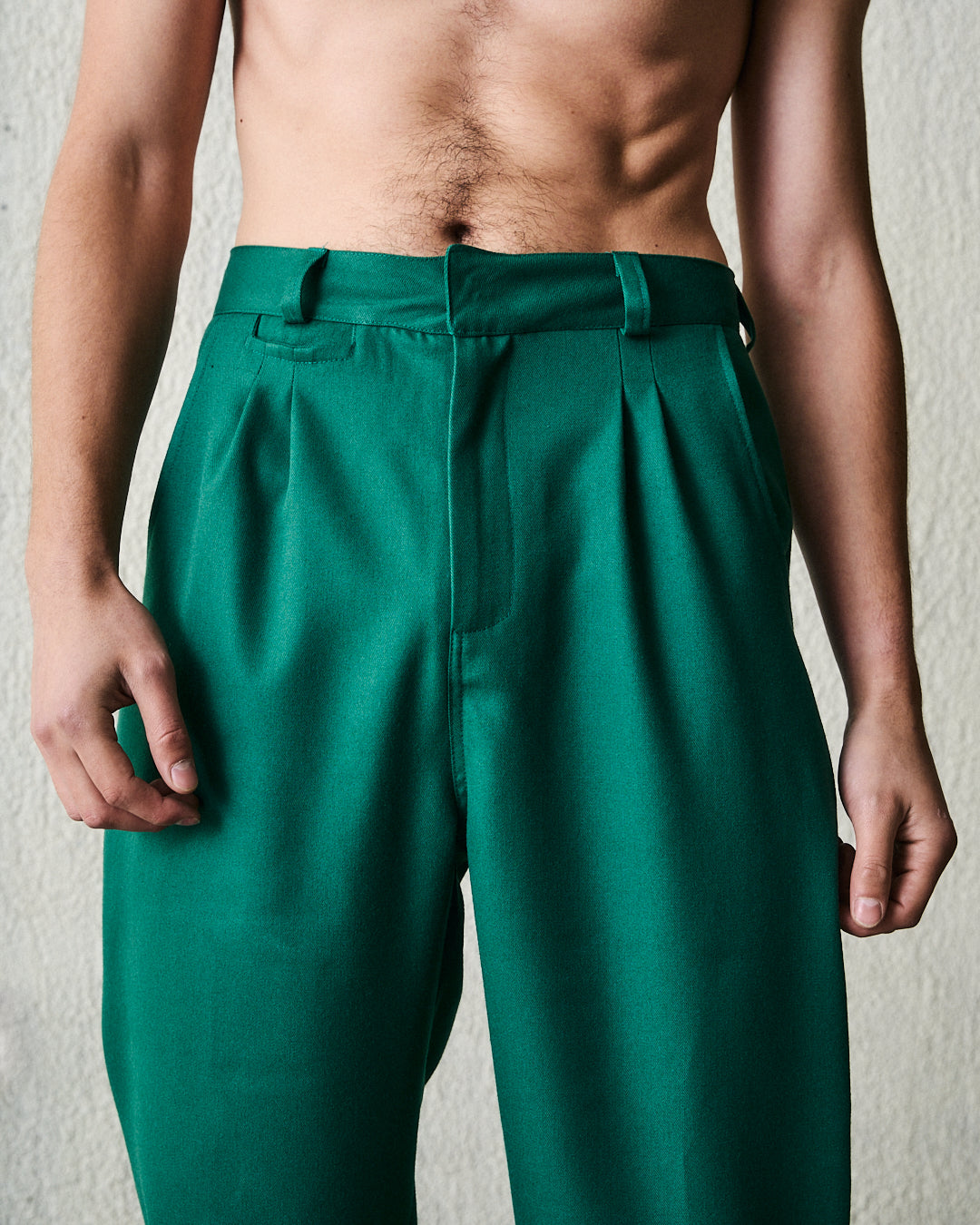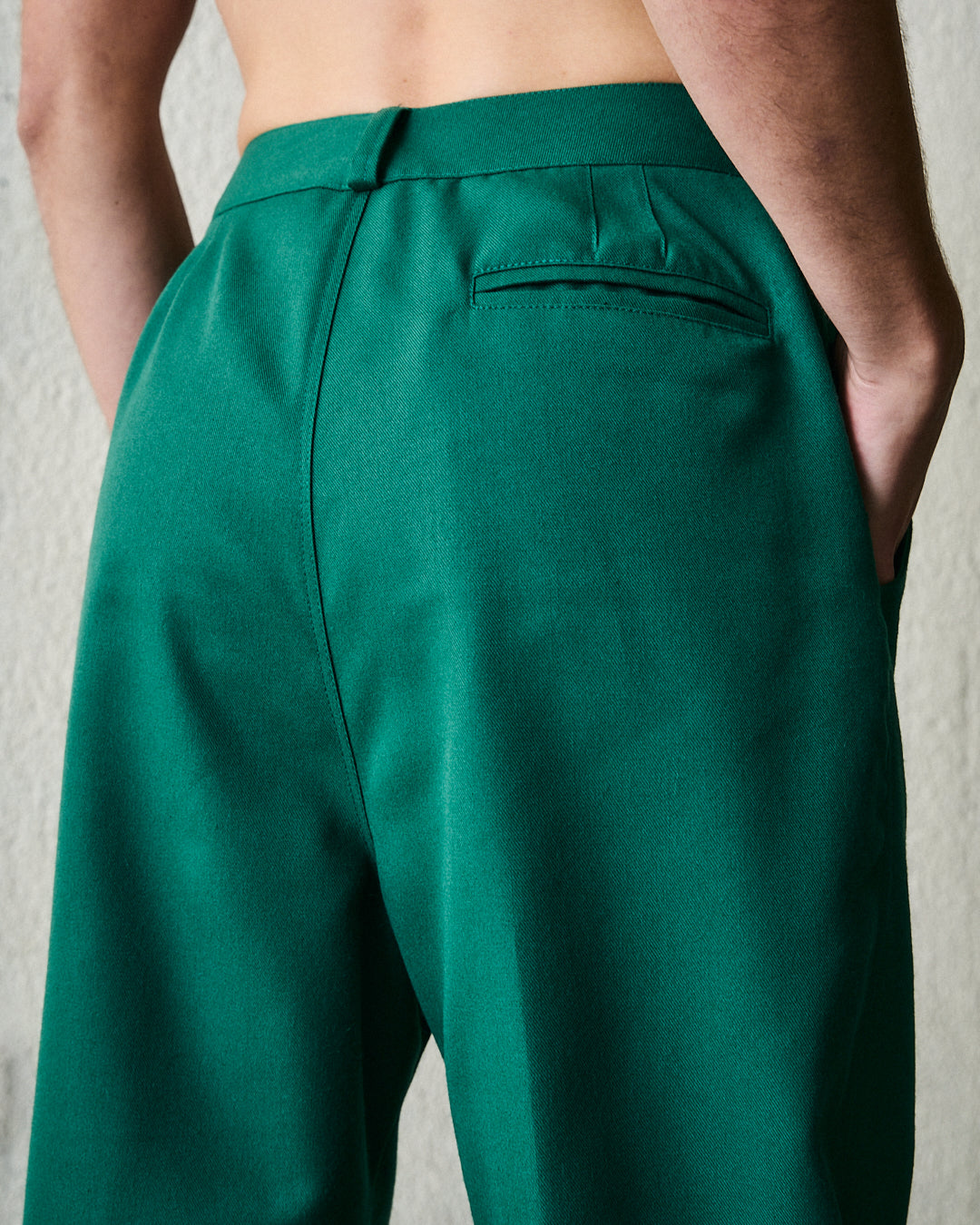 Pantalón inspirado en el diseño de pantalones del gaucho uruguayo, estilo bombacha, con puños en basta. Confeccionados en gabardina color verde. Unidades limitadas.