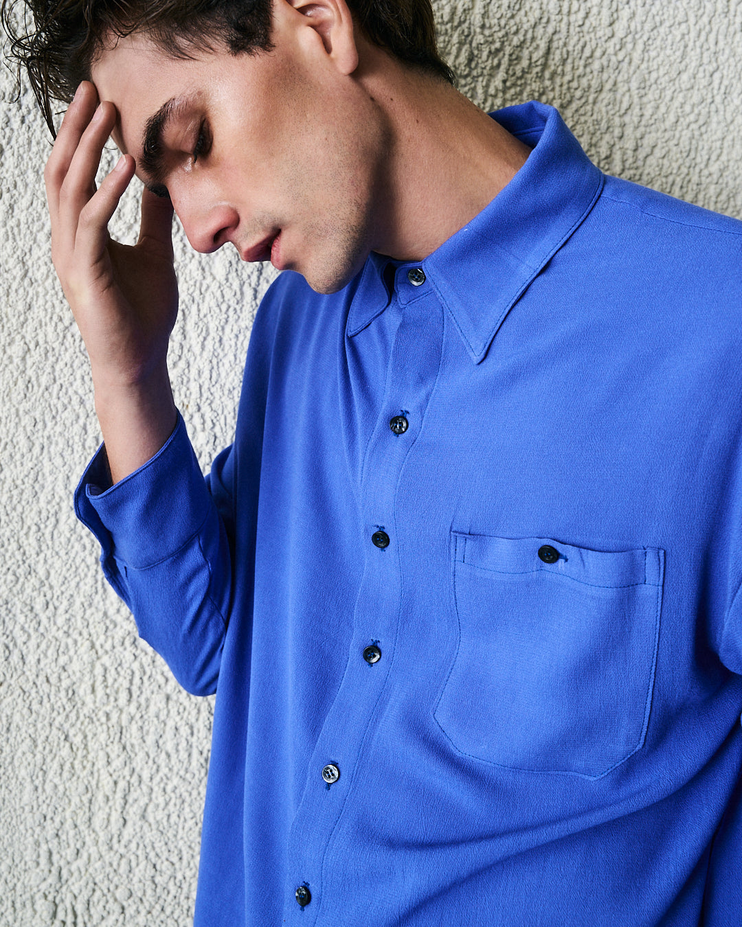 Camisa confeccionada en viscosa celeste, tono azul paquete vela. Tela muy suave al tacto, similar al algodón.