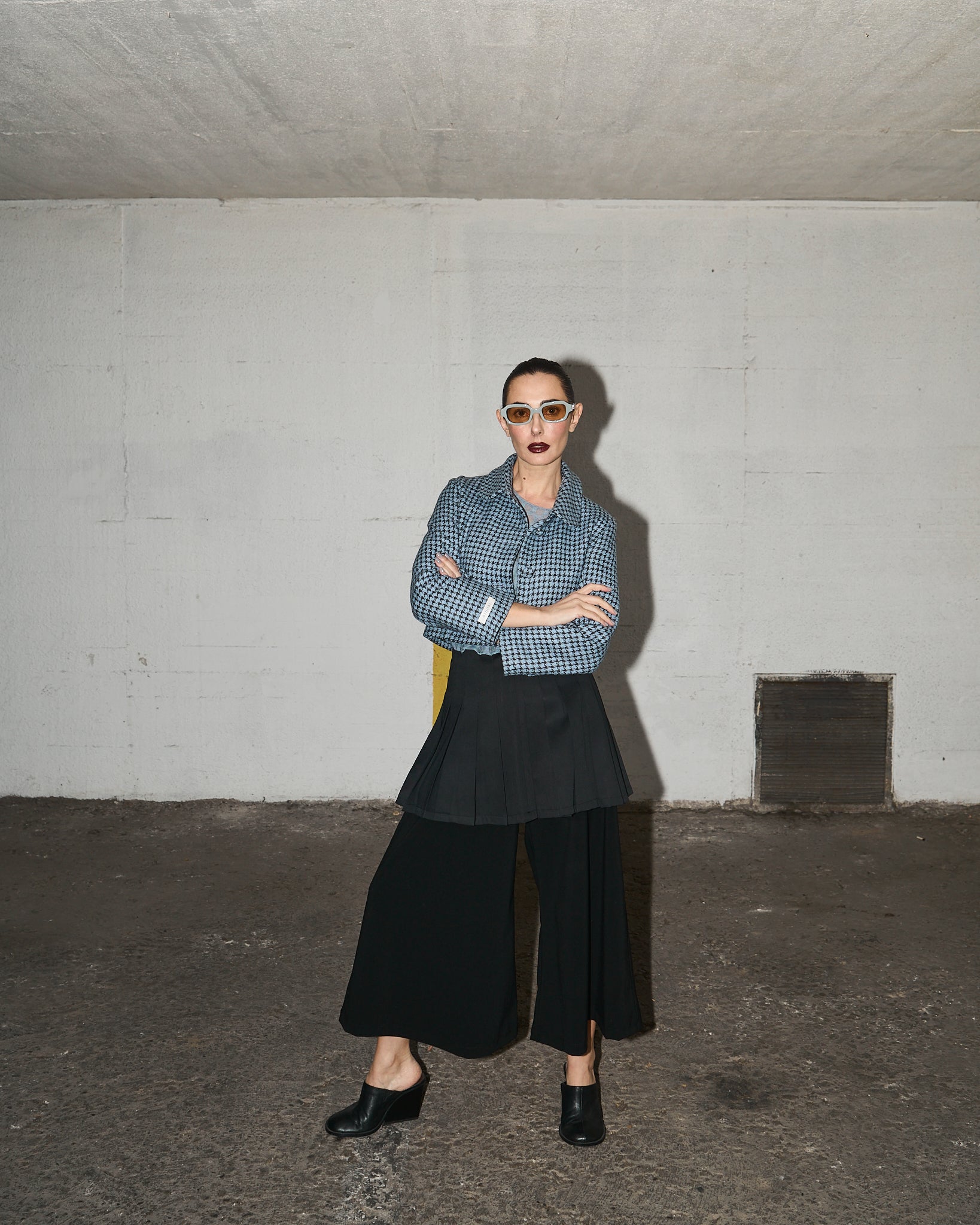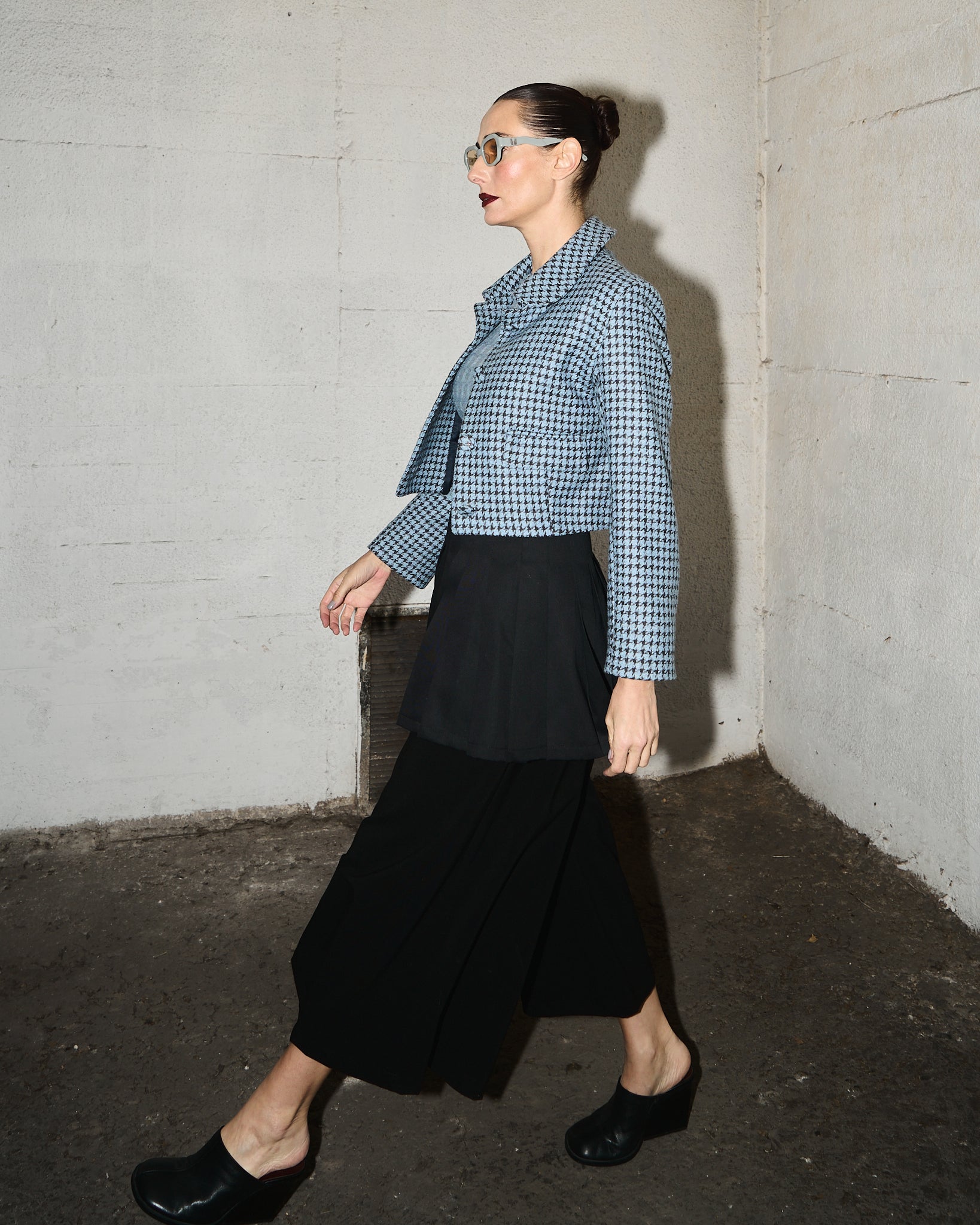 Chaqueta modelo Midori confeccionada de paño de lana de la antigua fábrica de telas Oveja Bellavista de Tomé. 100% lana, estampado pata de gallo en combinación celeste y marengo.