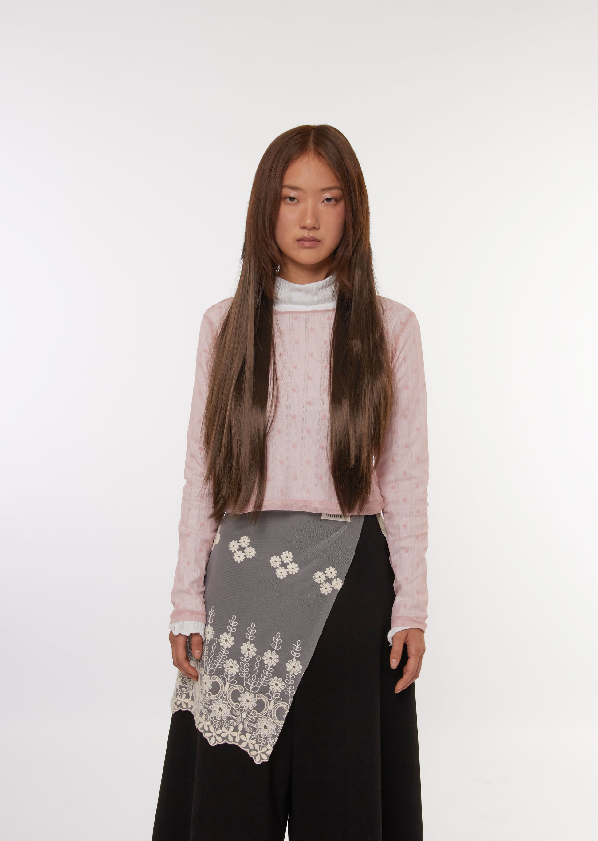 Tapado estilo pareo para utilizar como accesorio sobre pantalones o faldas, confeccionado en encaje ligero con diseño floral. Talla unica.