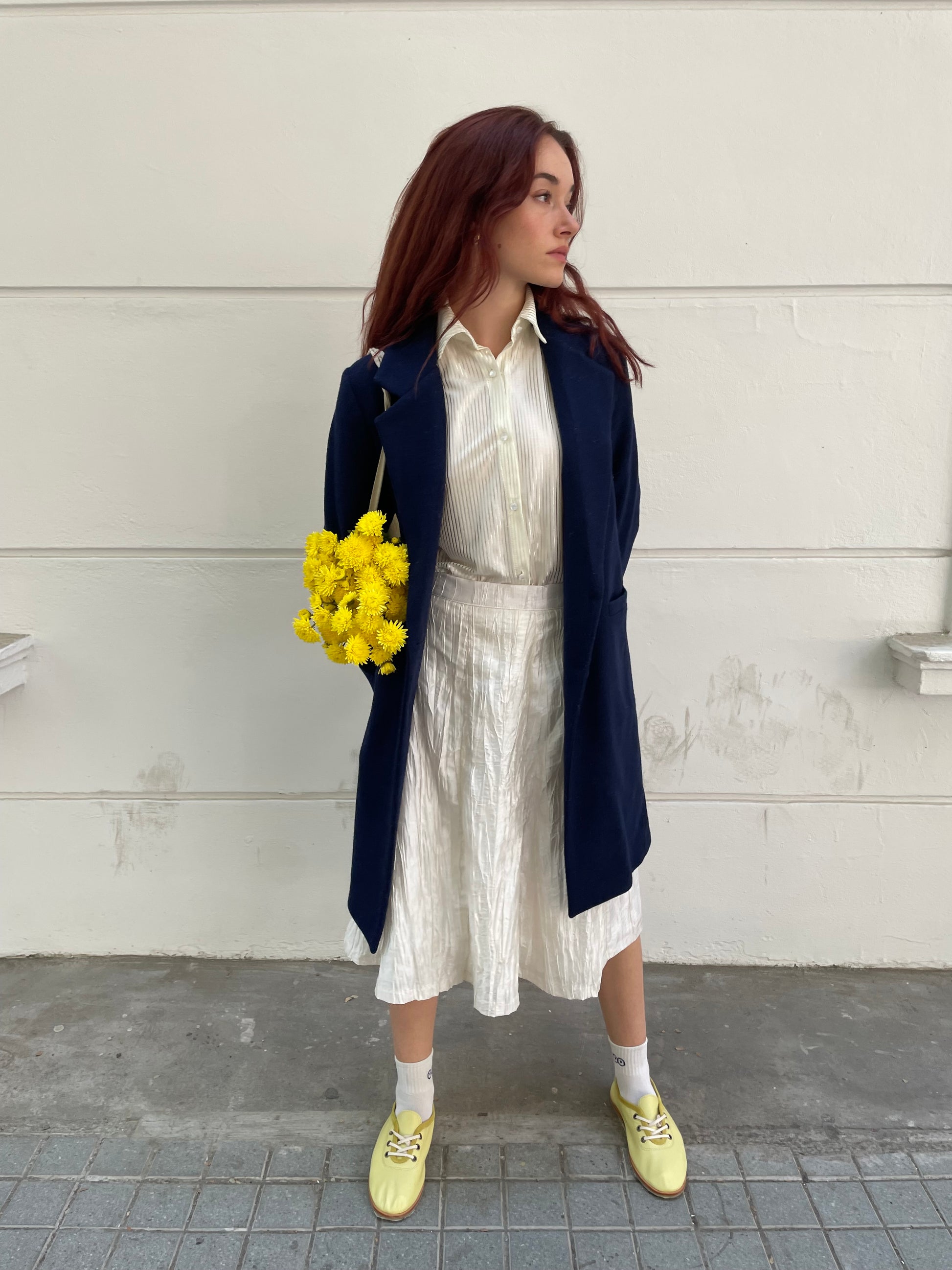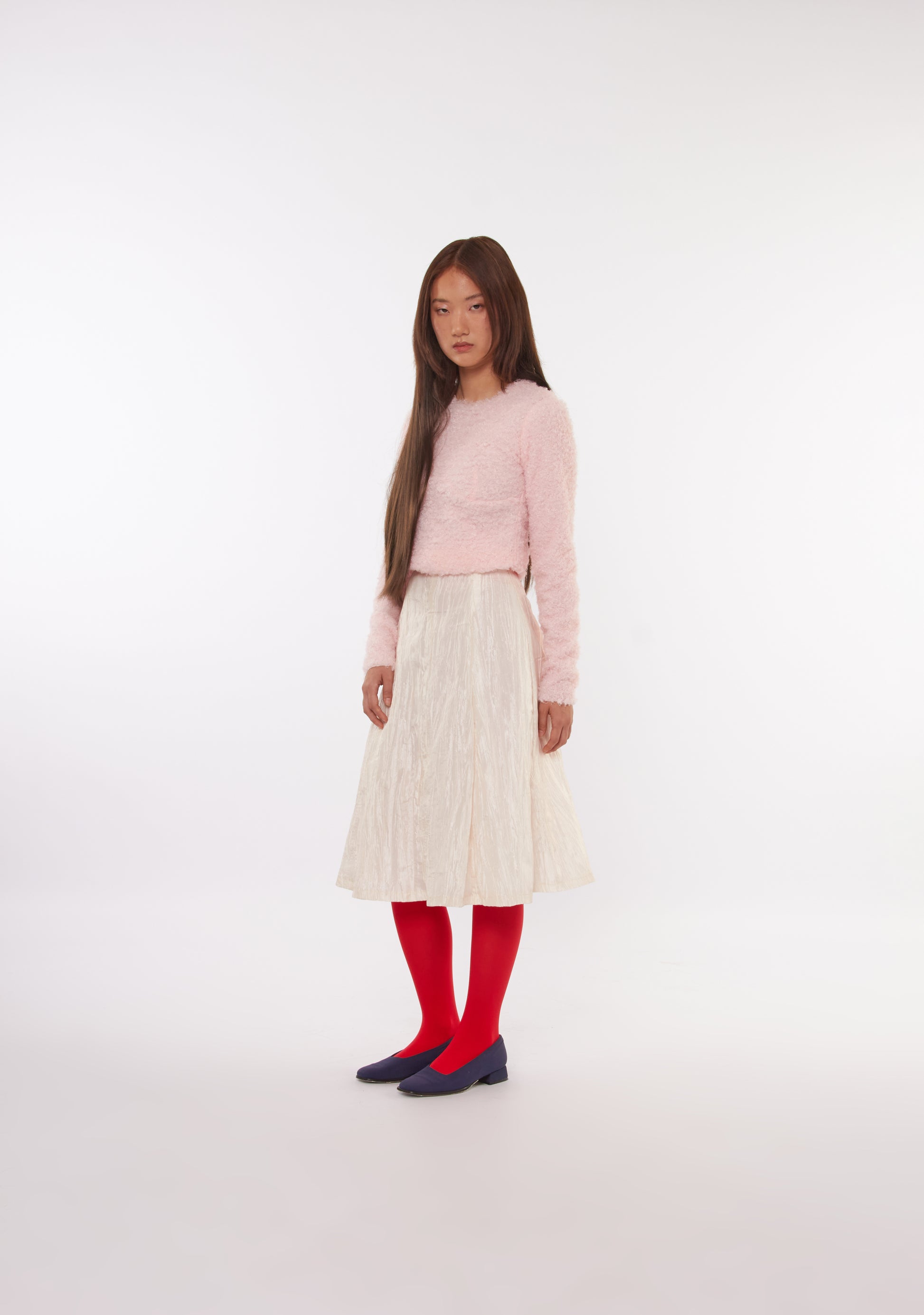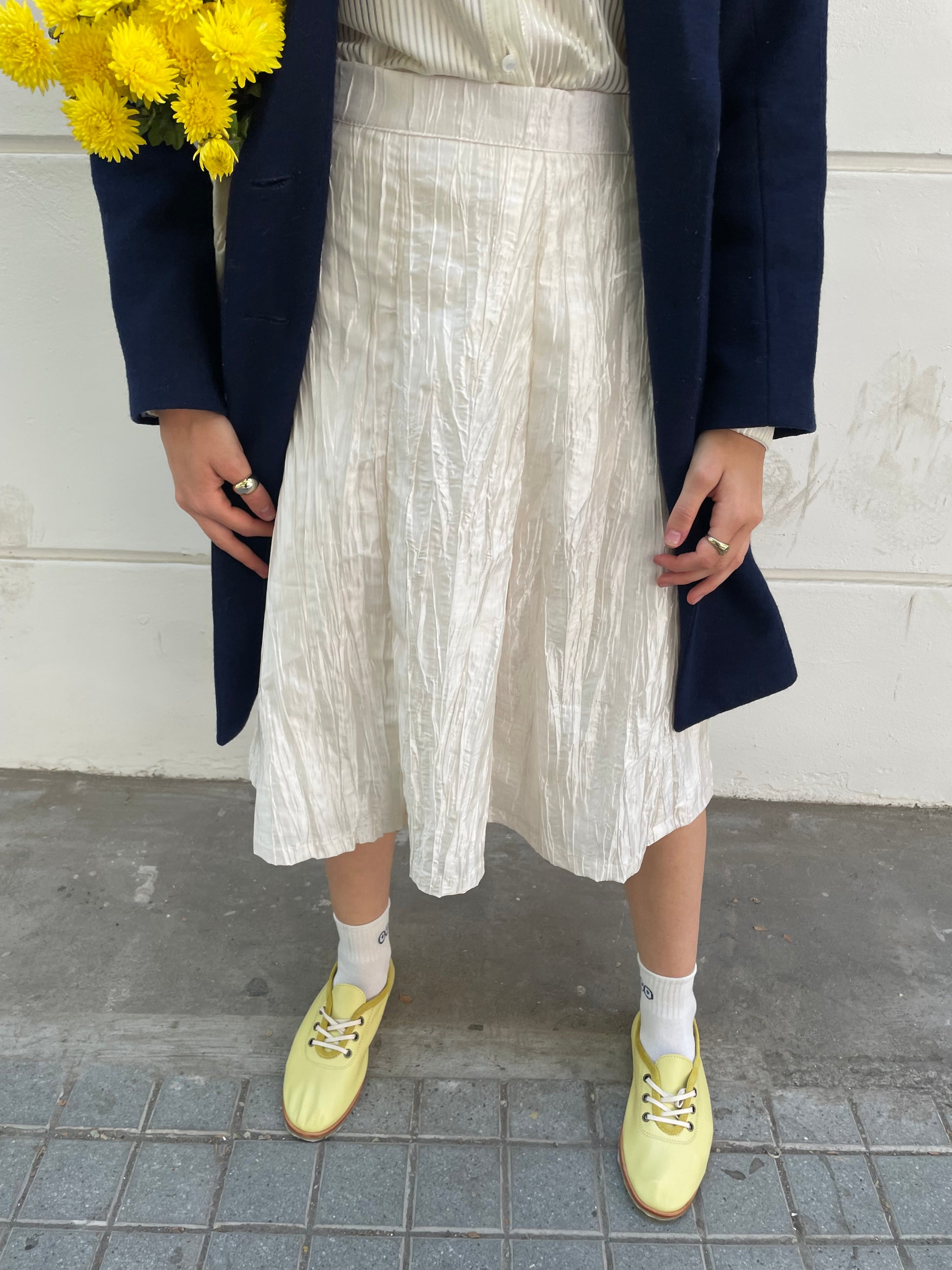 Falda confeccionada en satin plisado color crema, forrada en su interior.