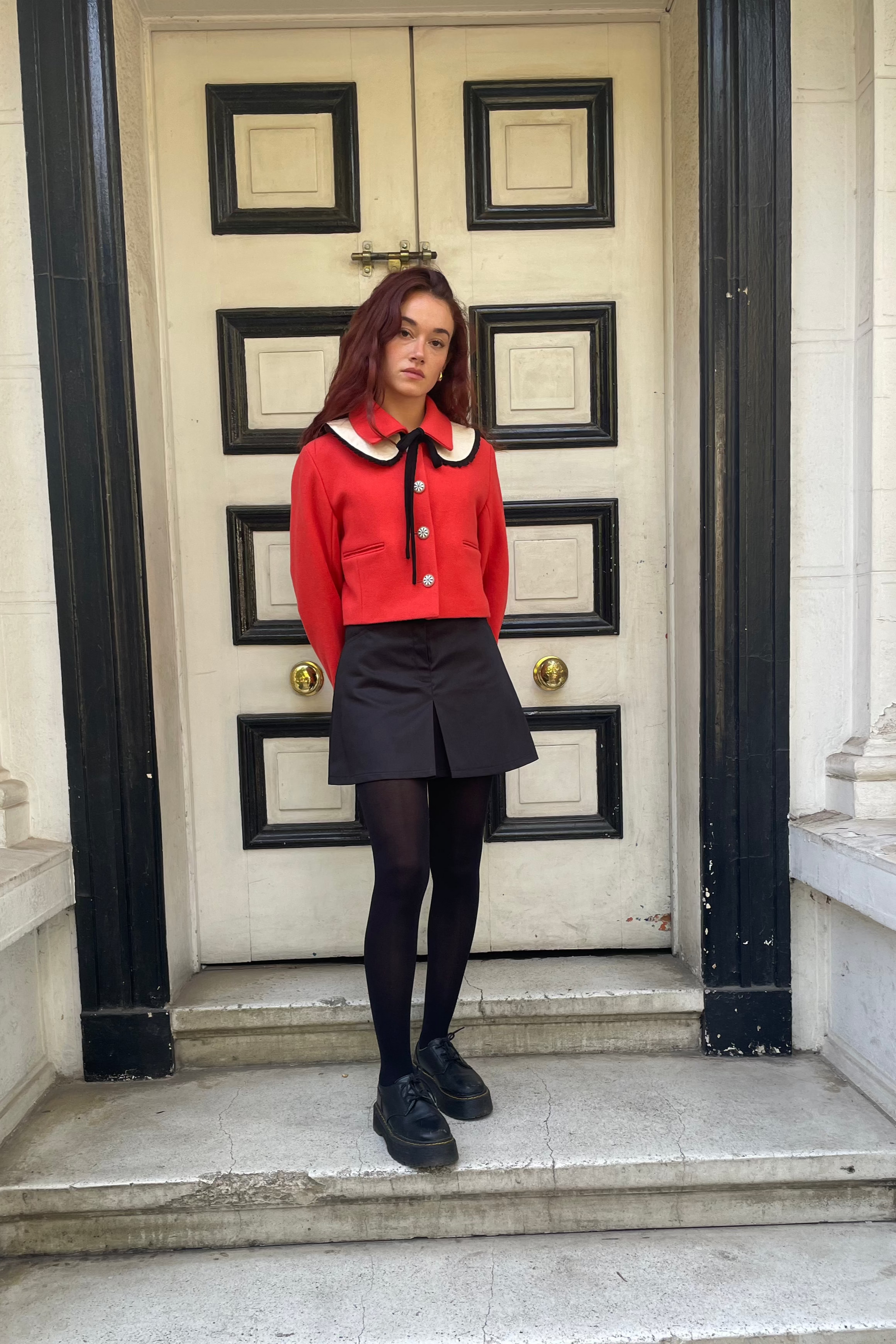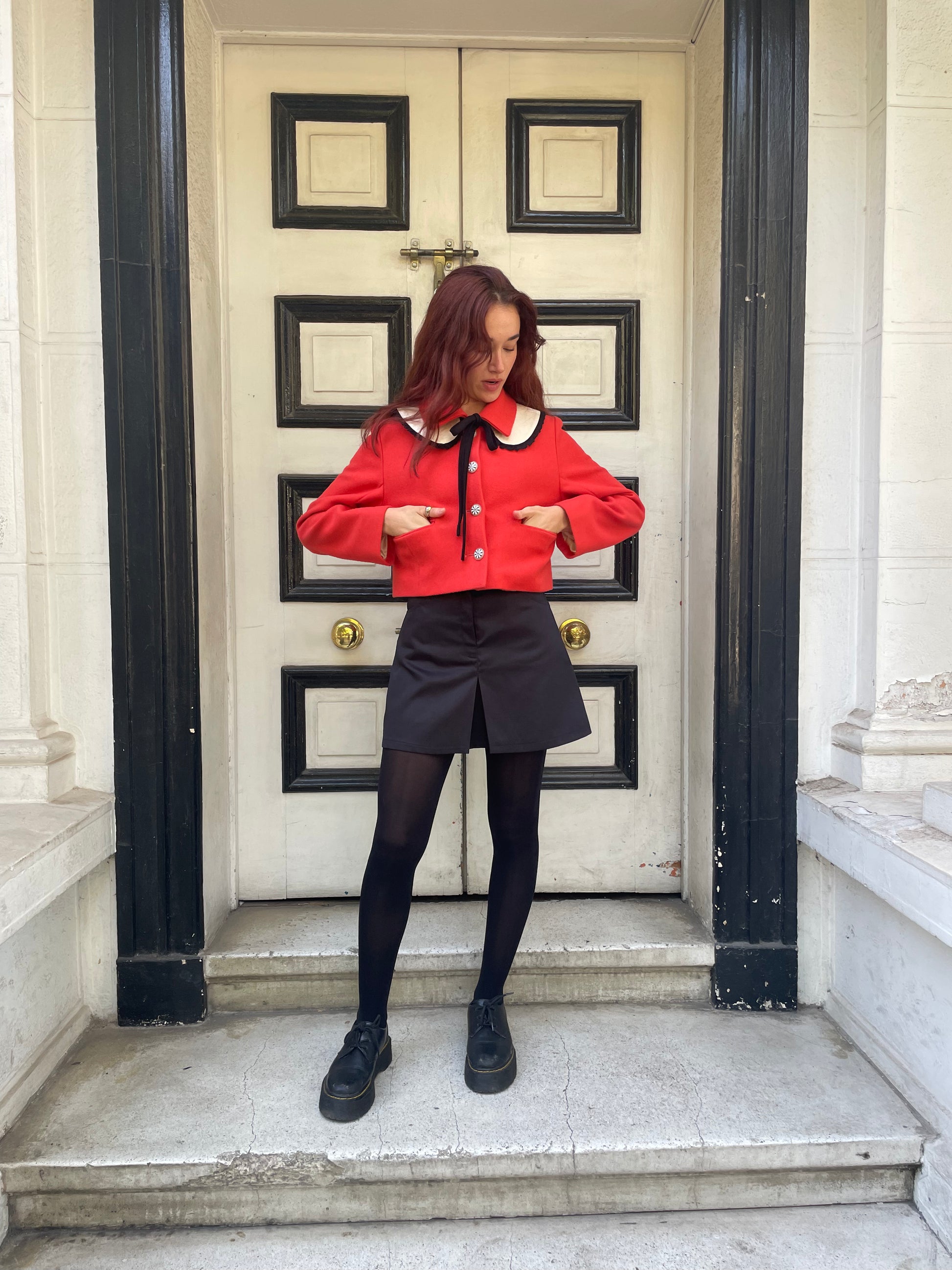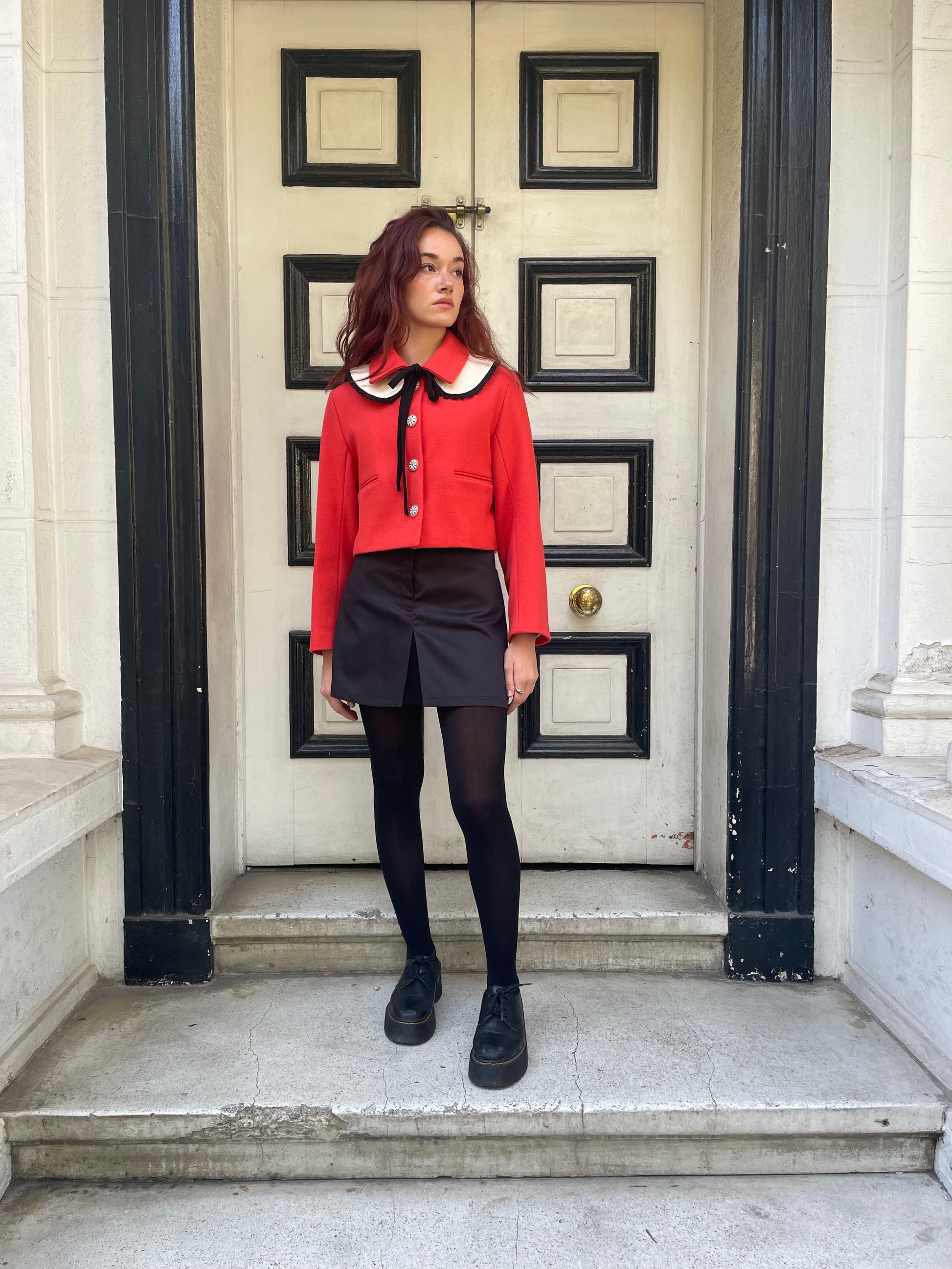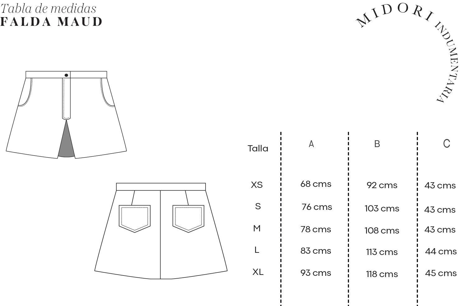 Falda Maud con tablón en frente, confeccionada en gabardina negra, bolsillos delanteros y traseros. Cierre frontal y broche.