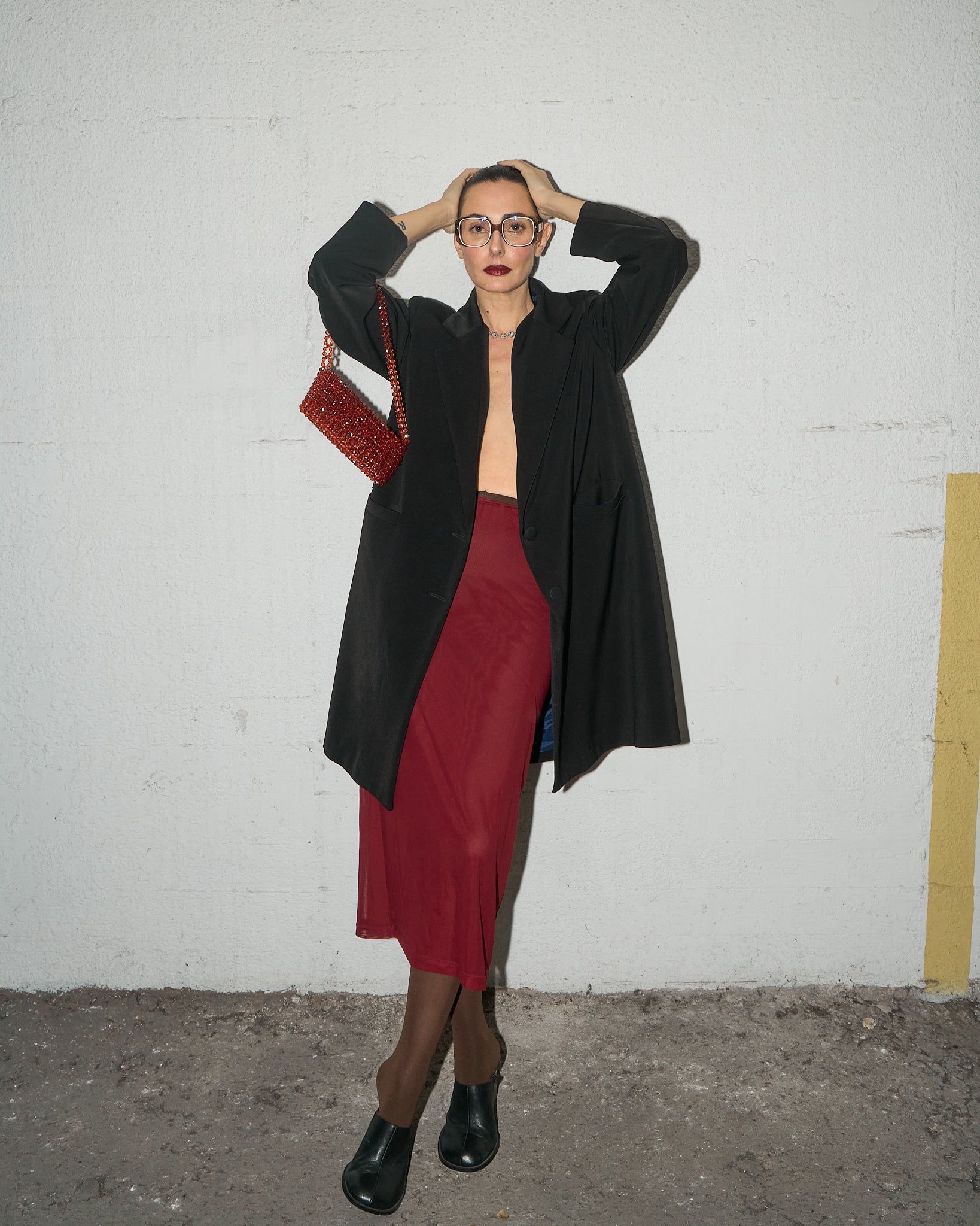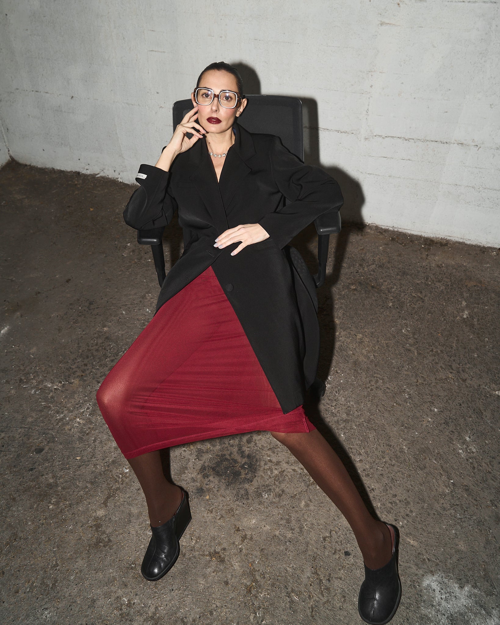 Falda tubo elasticada confeccionada en malla burdeo, ideal para usar abajo con pantys o calzas. También sirve como un cover-up para pantalones y faldas.