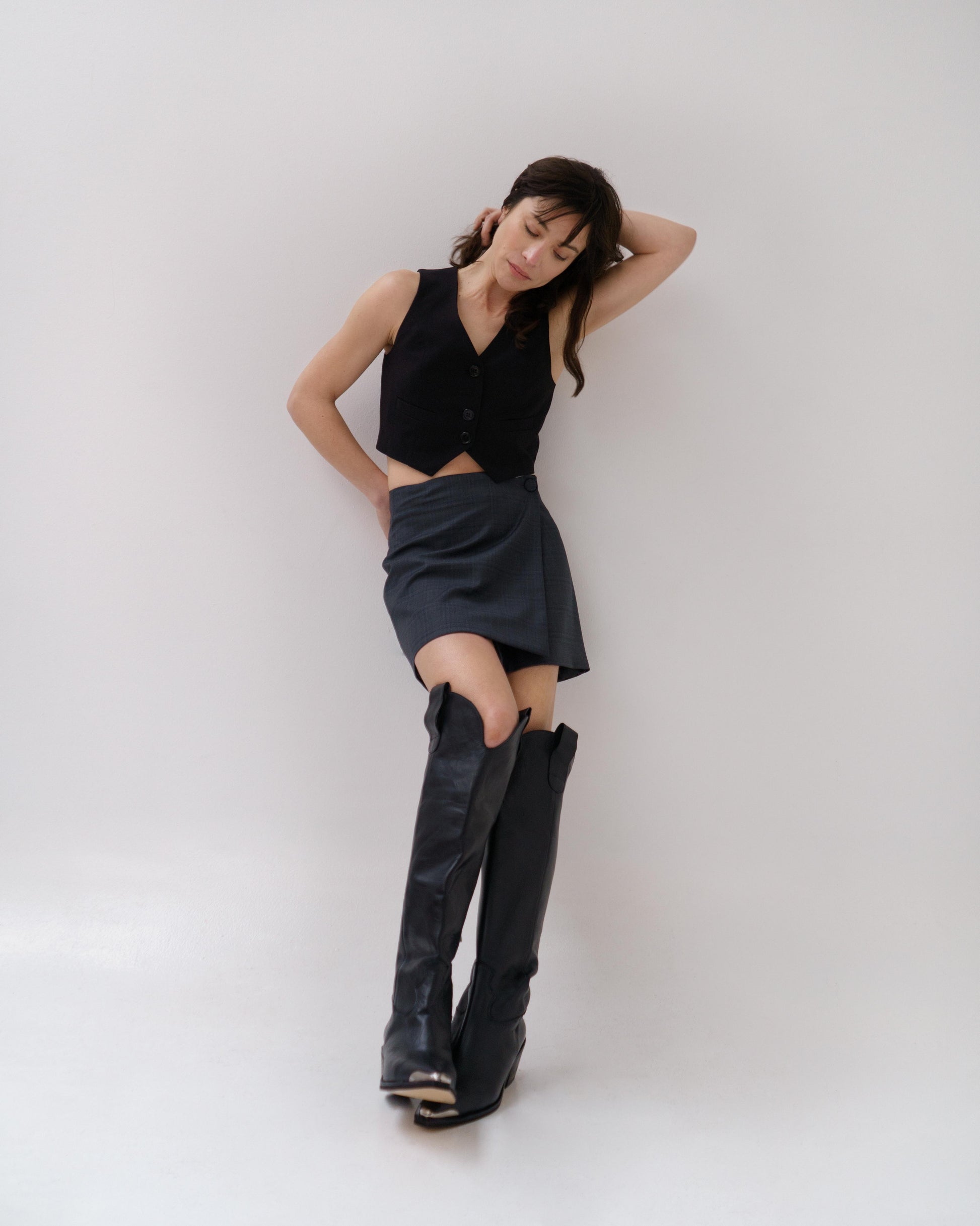 Nuevo Gilet David confeccionado en 65% algodón 35% viscosa negra, con pasador en espalda para ajustar cintura, completamente forrado en su interior.