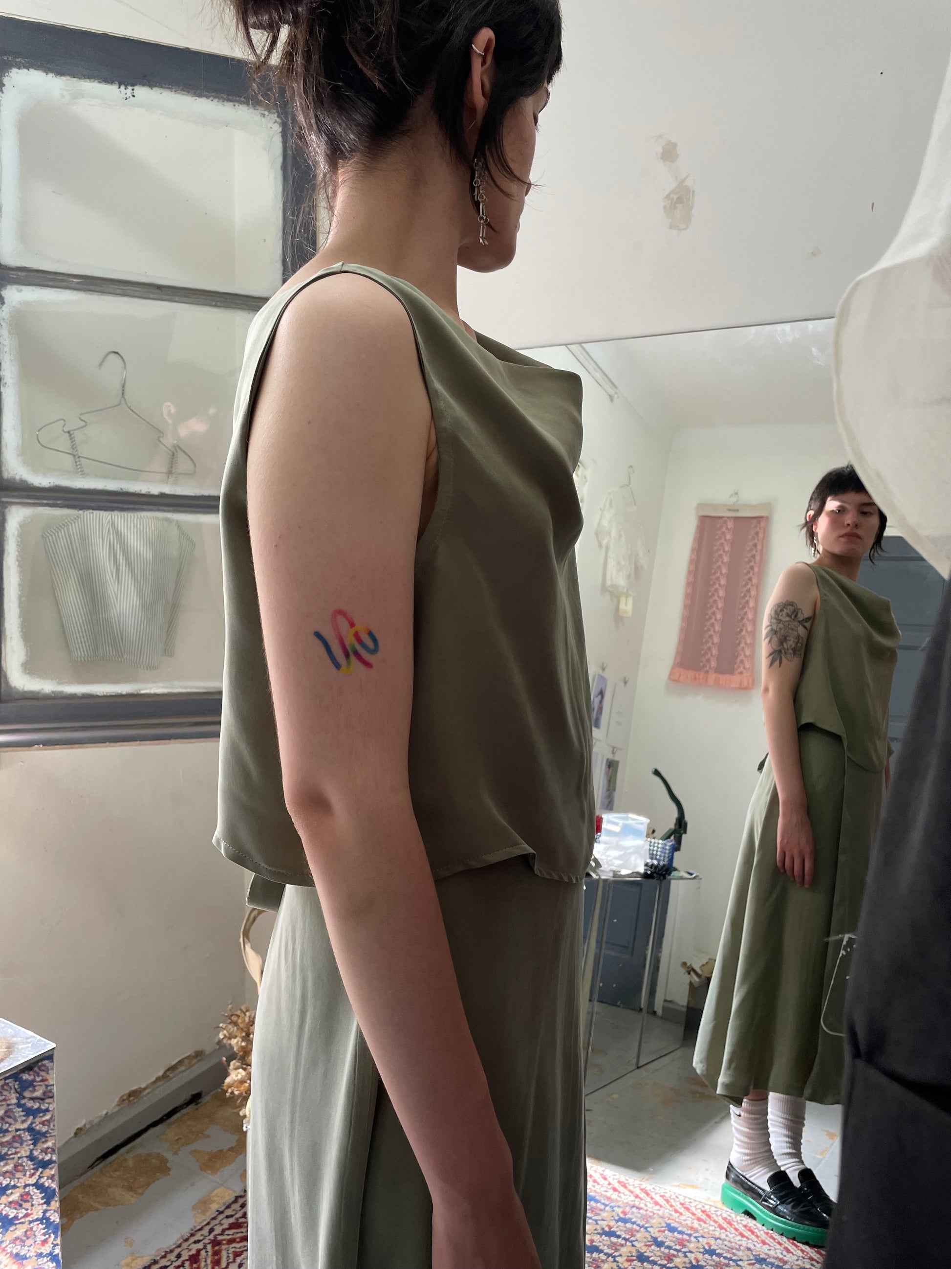Set compuesto por nuestra nueva falda envolvente, estilo pareo con lazo en tono verde musgo más top Zelda con escote recogido y espalda en v.