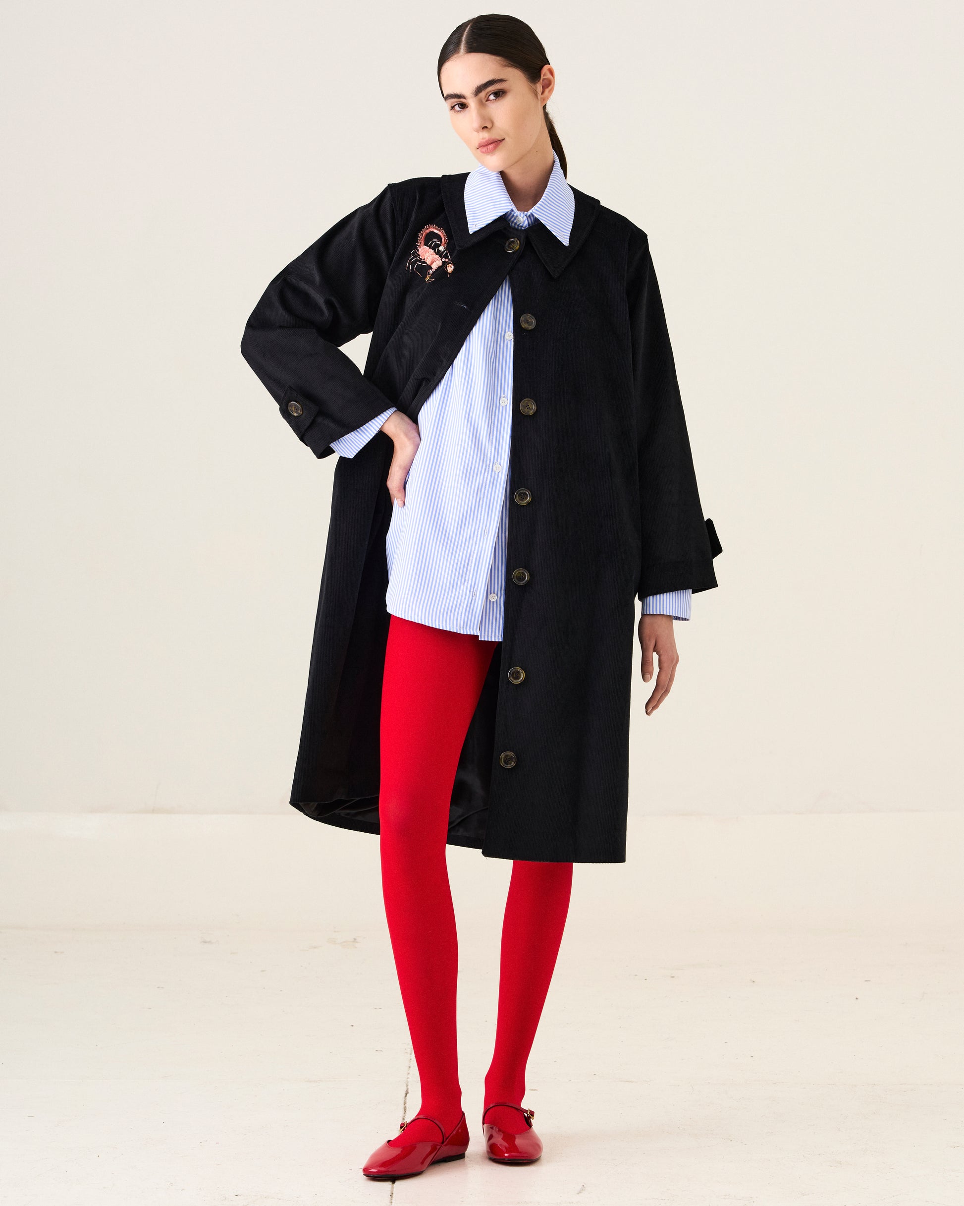 Modelo de chaqueta trench confeccionada en cotelé negro 100% algodón, forrado completamente en su interior. Modelo de calce oversize.
